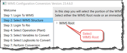 At Step 2: Select WIMS Structure.  You should pick the same Location that you choose when originally setting up your Rio configuration.  This is almost always WIMS Root.