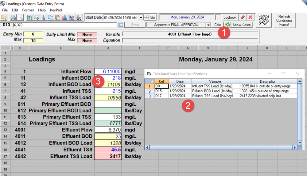 2. The Calculated Vars Limit Notifications are displayed. This shows any regulatory or entry limit flags that were caused by that calculation (and the variable is displayed on the form). NOTE: Click on a row in the notification form and the CDE cell will be set.