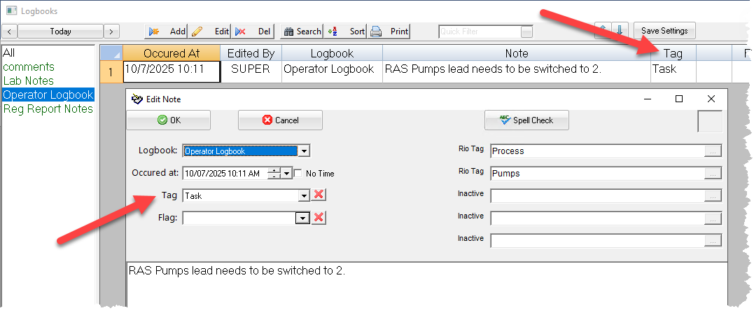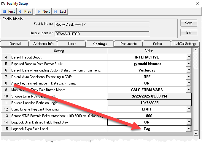 Logbook Type Field Label Facility Setting is used to rename the Logbook Type field. Changes the label to Tag to better correspond with Rio Logbook entries that have tags.