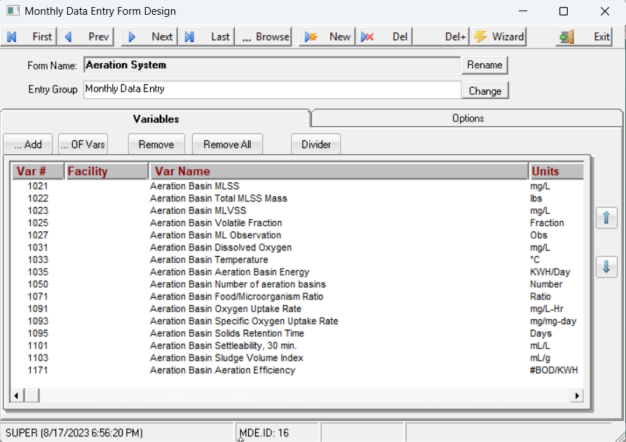 Once a form is created, you will be able to access it from the Data Manager menu. Designing a Monthly Data Entry form is very simple. Select Design, Monthly Data Entry Forms. The form design screen will be displayed. If you have not designed any forms yet, the design screen will be empty allowing you to choose your variables, options, and form name for your first form. If there are existing forms, the first form will be displayed. Once in the design form you may choose the variables you wish to work with in any order you decide, and name your new form. You may either exit the design form by clicking the [Exit] button, or you may choose [New] to continue with the creation of another form (changes are automatically saved).